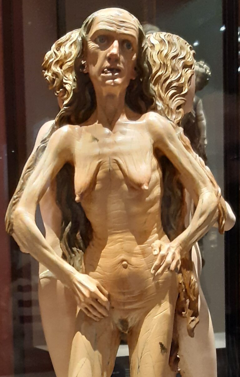 Gleich über die Stiege auf die Ebene 0.5 ging es direkt in die Kunstkammer. Auch wenn wir schon öfter dort waren, hatten wir uns längere Zeit nicht auf Tiere konzentriert. Es begann bei der Skulptur „Allegorie der Vergänglichkeit“, 1470/1480 von Micheal Erhard. Sie besteht aus drei geschnitzten Figuren unterschiedlichen Alters und Geschlechts. Auf der Brust und dem Oberschenkel der älteren Frau ist je eine Fliege zu entdecken. Im gehobeneren Alter fehlt wohl die Schnelligkeit, um das lästige Insekt zu vertreiben!?
