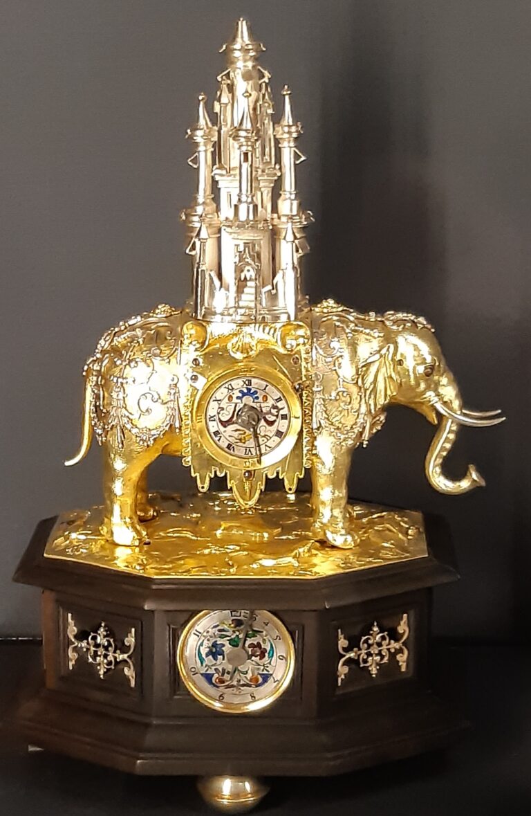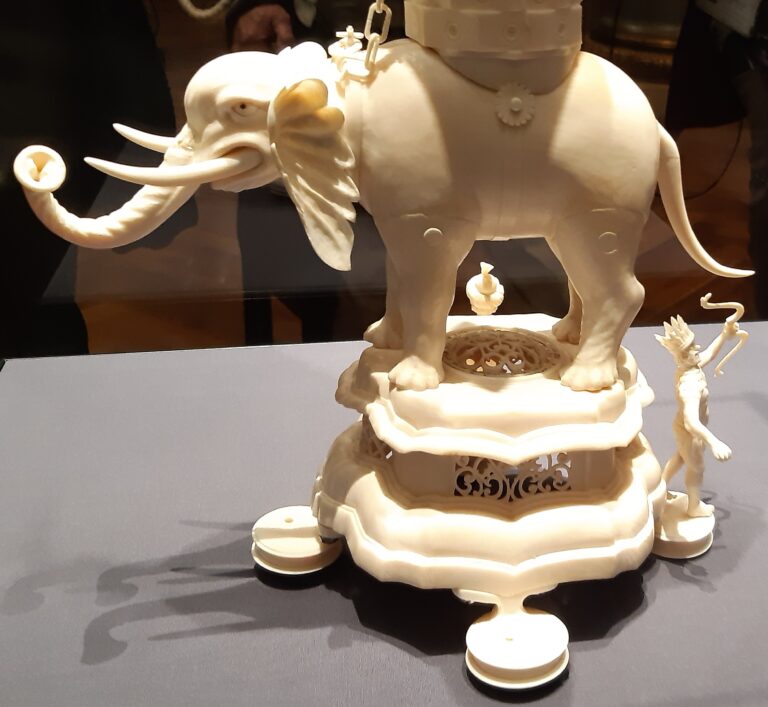 Zum Schluss zeigte uns Andrea noch zwei Elefanten der besonderen Art. Der eine ist edel auf einer Automatenuhr zu sehen. Er trägt am Rücken einen Turm und wurde von Tobias Kramer zwischen 1614/16 in Augsburg (D) hergestellt. Das zweite Rüsseltier ist aus Elfenbein für einen Tafelaufsatz, 1639 geschnitzt worden. Als Künstler wird dafür Markus Heiden ebenfalls aus Deutschland angeführt.