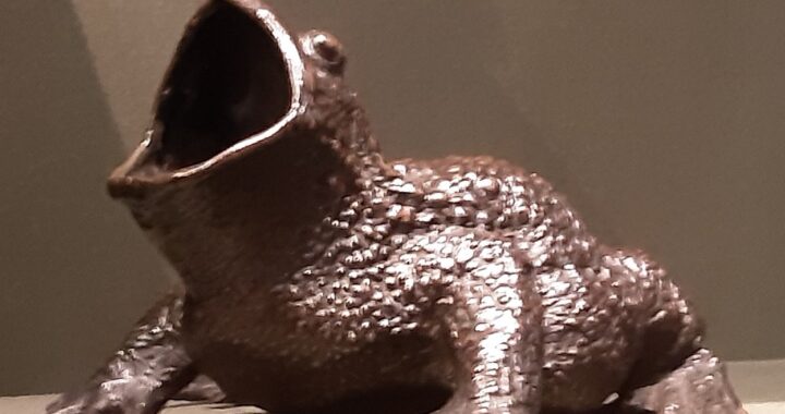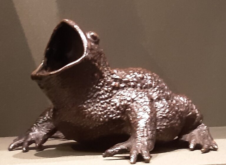 Padua (Italien) galt als das Zentrum der Bronzekultur und widmete sich der Natur und Antike. Die Kröte diente als Sand- und Salzgefäß und hatte das Maul wie zum Quaken weit wie möglich aufgerissen.