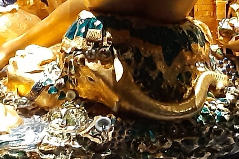 Gleich ums Eck steht das berühmte Salz- und Pfeffer-Tischgefäß Saliera, 1540-43 von Benvenuto Celline. Aber nicht die Geschichte vom Diebstahl interessierte uns. Auch hier sind besondere Tiere zu entdecken. Während die Göttin der Erde Tellus auf einem kleinen Elefanten sitzt, ist der Meeresgott Neptun auf ein paar Hippokampen zu sehen. Das ist ein Fabeltier aus Pferd und Fisch.