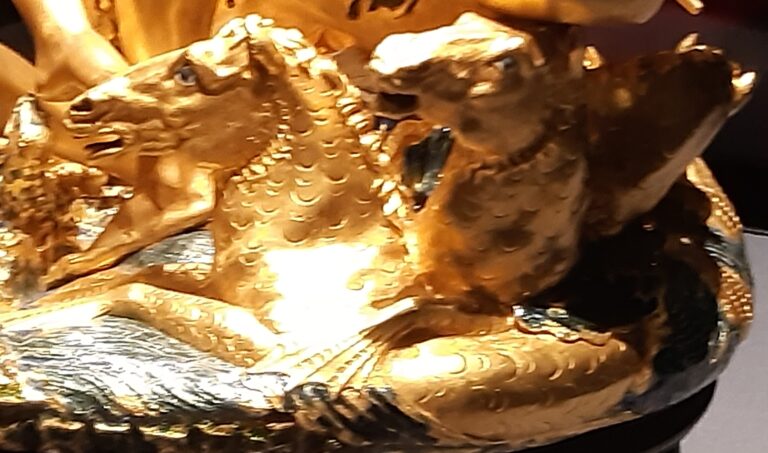 Als nächstes machte uns Andrea aufmerksam, dass es wohl auch weibliche Drachen gibt. Auf einer ovalen Dose mit Deckel gibt es zwei Griff mit Drachen Damen zu sehen. Auf deren Brust glänzte uns ein BH entgegen. Allerdings gab Sigrid zu bedenken, dass wir uns im Weltmuseum schon einmal die Ritterrüstungen angesehen hatten. Dieser Metallschutz wurde doch nur von Männern getragen und haben auch Ausbuchtungen im Brustbereich. Nachdem die Drachen auch keine lebenden Tiere waren, wird es doch keine Bestätigung für die Geschlechtertrennung von Drachen geben!? Noch dazu gibt es heute beim Geschlecht auch noch „diverses" ...