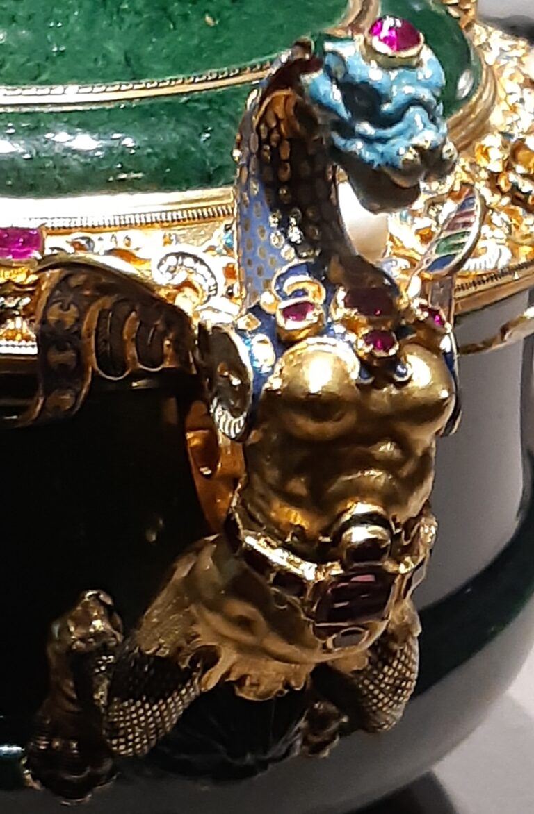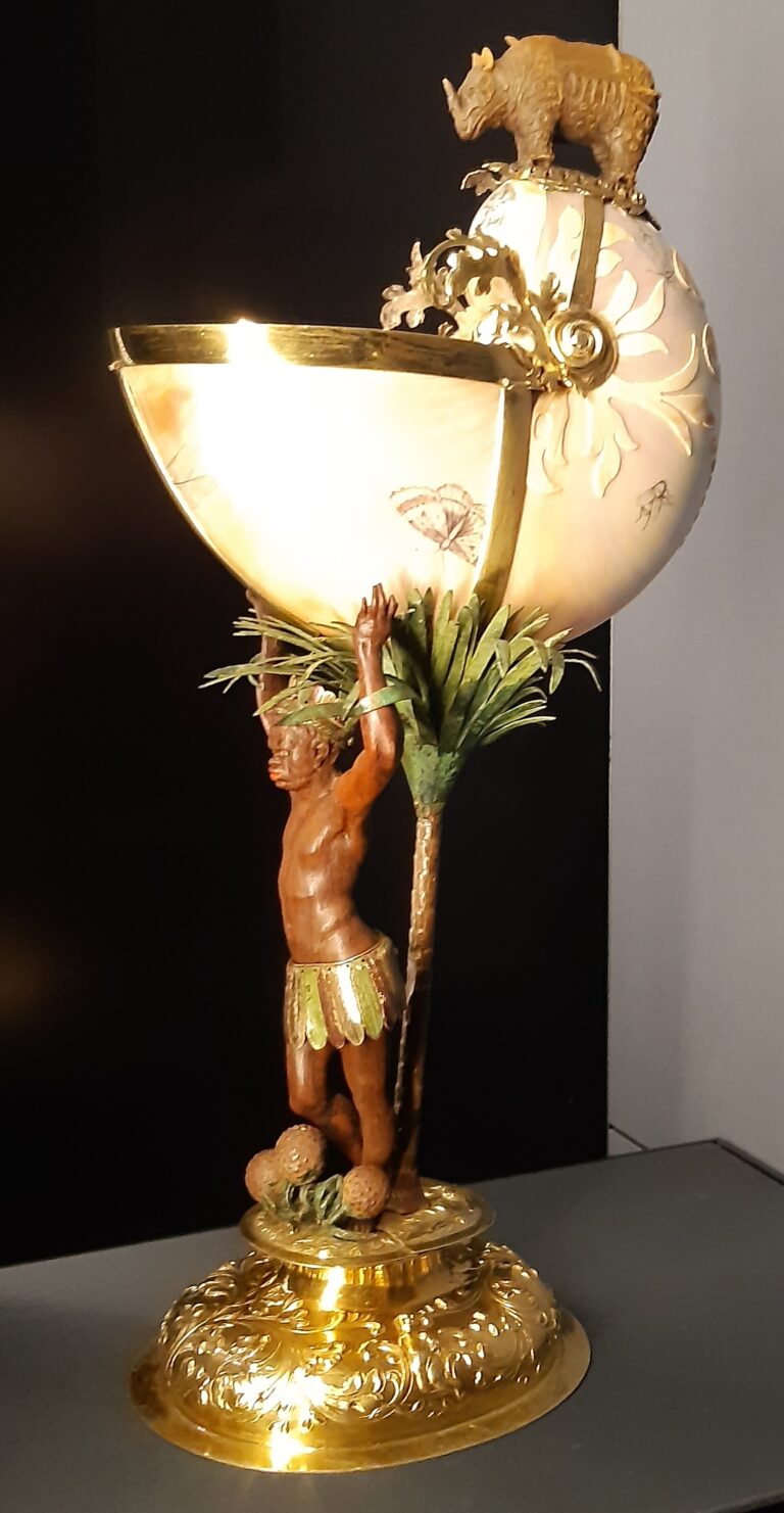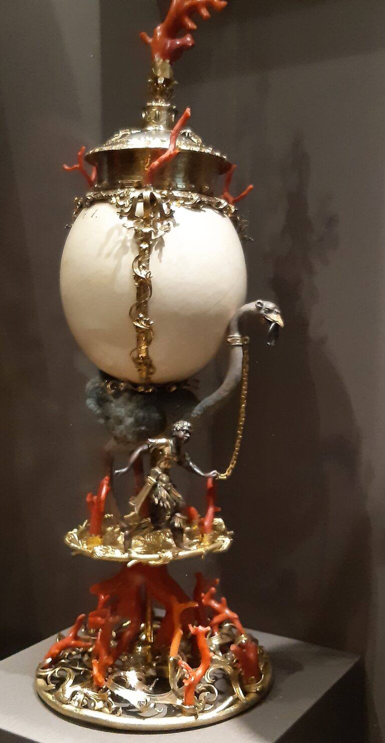 In der Kunstkammer gibt es viele Schätze zu finden. Zum Beispiel ein Straußenei, dass verziert von einem dieser großen eierlegenden Vögel getragen wird. Der führende Mann ist im Vergleich wirklich sehr klein geraten. Auf der Nautilus Schnecke ist oben noch ein Nashorn zu entdecken. Dieses Tier galt früher als sehr edel und waren hoffentlich nur früher wegen ihrer Nase aus Elfenbein gejagt worden.