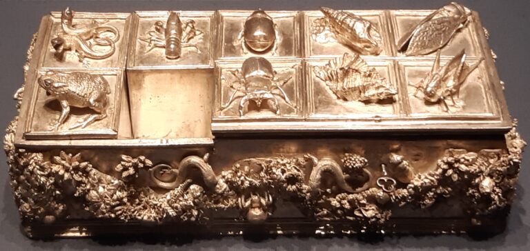 Maria machte im selben Raum auf eine silberne Kassette für verschiedenes Schreibzeug aufmerksam. Sie stammt von Wenzel Jamnitzter um 1560/70 aus Nürnberg (D). Er hatte öfter für das Haus der Habsburger gearbeitet. Die acht Boxen für das Schreibmaterial sind mit Abgüssen von kleinen Tieren, wie Muscheln und Insekten besetzt. Es ist erstaunlich, wie detailgenau diese kleinen Lebewesen und auch Pflanzen gestaltet wurden.