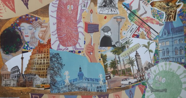 Unsere Begleiterin Julia Haimburger erklärte uns, was uns für eine eigene Collage alles zur Verfügung stand. Es gab Zeitungen, Fotos und Bilder. Auch Klebebänder lagen bereit. Als Untergrund waren Papiere jeder Art möglich. Zur Anregung gab es noch eine Inspirations-Frage: „Was möchtest du verbinden oder wo möchtest du Zusammenhalt stärken?“ Bei so viel Angebot musste sich jeder erst einen Durchblick verschaffen. Aber dann gab es viele einzelartige Ideen.