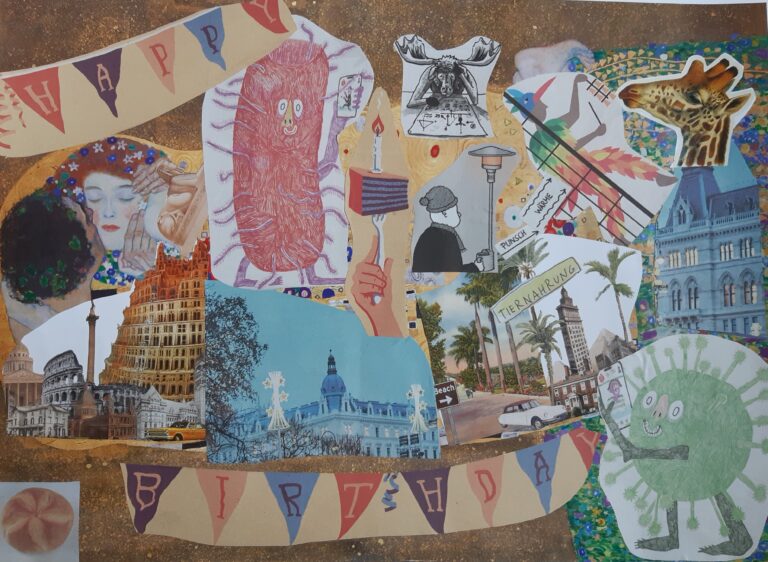 Man kann sich gar nicht vorstellen, was dabei alles möglich ist. Jeder hatte mit der Schere viel auszuschneiden. Es ist unglaublich, was für so eine Collage alles möglich ist. Mehr oder weniger war es viel Glück, welches passende Material man fand und unvorstellbar, was dabei alles kombinieren wurde.