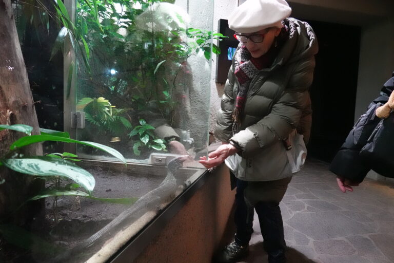 Nachdem unsere vom Dunst belegten Brillen den Blick wieder frei gegeben hatten, durchsuchten wir die einzelnen Terrarien mit Watanen, Kröten, Geckos und Skins. Renate war von ihrem „Lieblings-tier“, dem blauen Baumwaran begeistert. Er ist vom Aussterben bedroht und kann den Greifschwanz wie sein fünftes Bein benützen.