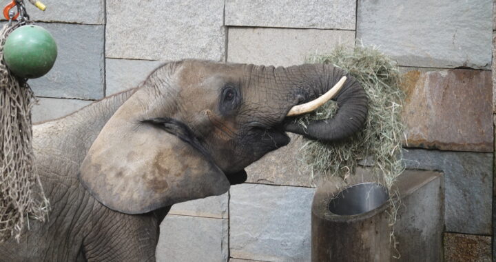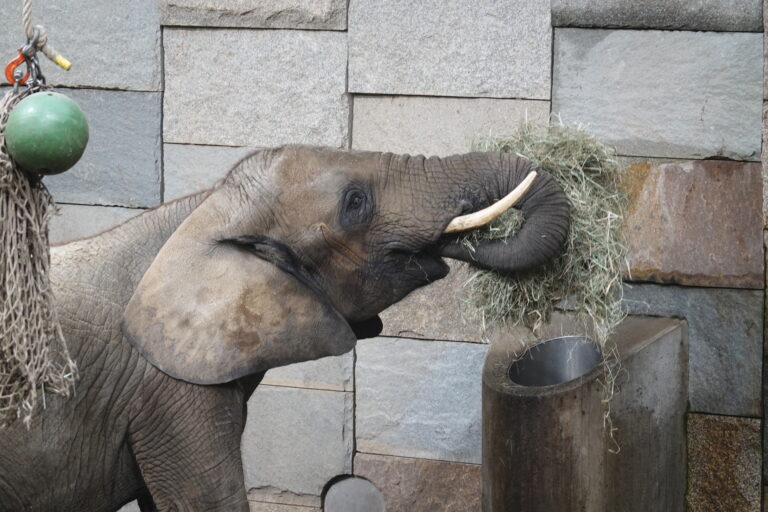 Bei den Elefanten wurde gerade Tonga gewaschen. Sie war vor über 40 Jahren vom Krüger-National-Park aus Südafrika nach Wien gekommen. Nachdem sie geputzt war, kamen ihre beiden „Jungen“ Mongo (23) und Jahwa (13) dazu. Gemeinsam erhielten sie eine große Ladung Heu. Das Wasserbecken machte das trockene Gras viel genüsslicher.