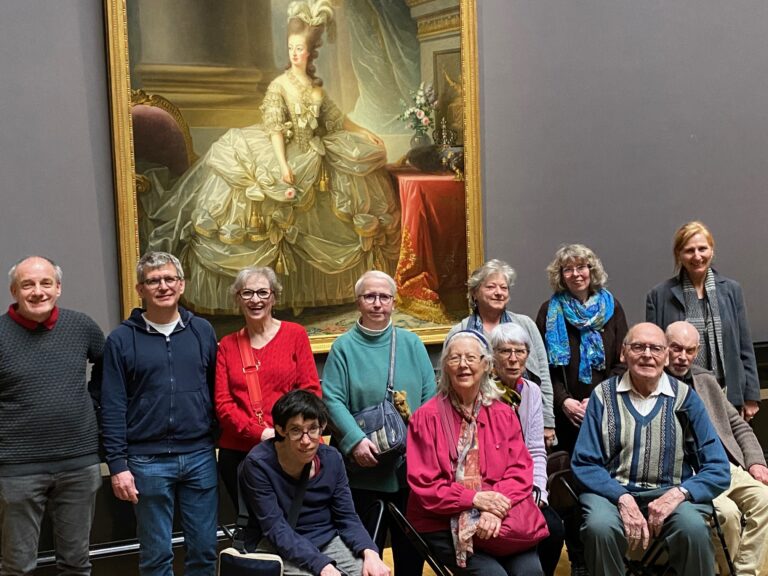 Vor dem nächsten Gemälde machten wir das Gruppenfoto. Darauf ist Maria Theresias jüngste Tochter Erzherzogin Marie Antoinette zu sehen. Hier war es für die Adelige besonders erfreulich, dass sie ihre Freundin Louise Elisabeth Vigée-Lebrun (1755-1842) dieses Bild hergestellt hatte. Die Habsburger Tochter war bereits mit 14 Jahren nach Frankreich gebracht worden, wo sie sich anfangs noch kindisch verhielt. Besonders auffällig ist die Turmfrisur, mit der sie die Mode beeinflusste. Dieses Bild wurde Maria Theresia nach Wien geschickt, die aber alles andere als erfreut darüber schien und sich „ergötzt“ fühlte. Wer sich noch erinnern kann, kennt das erschreckende Ende. Marie Antoinette wurde 1793 wegen Hochverrat hingerichtet, wo ihre Mutter Maria Theresia noch am Leben war.